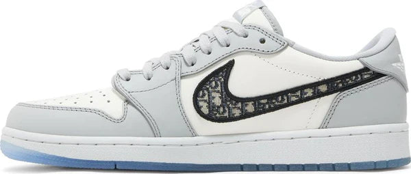 Lançado como parte de uma coleção maior com a estimada casa de moda parisiense, o Dior x Air Jordan 1 Low apresenta um esquema de cores simples de dois tons na parte superior, apresentando uma base de couro italiano branco com sobreposições sutis de couro cinza. Os elementos da marca incluem uma etiqueta de língua trançada Dior Air, Swoosh jacquard Dior Oblique e um logotipo Dior Wings na aba do calcanhar. Os tênis feitos na Itália são finalizados com solas translúcidas revelando hits adicionais da marca por baixo.