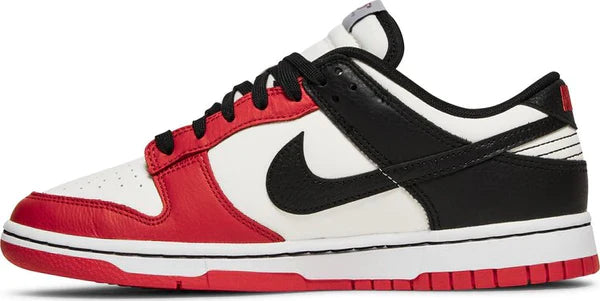 O NBA x Nike Dunk Low EMB “Chicago” é uma edição especial do tênis clássico de basquete e estilo de vida que celebra o aniversário de 75 anos da NBA. Como o próprio nome indica, a edição “Chicago” é inspirada no Chicago Bulls e nas cores do uniforme vermelho, preto e branco do time. O sneaker apresenta uma base de couro branco com painéis contrastantes de couro vermelho Chile na biqueira, antepé e ilhós. Couro preto pode ser encontrado na gola e no calcanhar, e no logotipo Swoosh que aparece em ambos os lados do sneaker. Um logotipo vermelho “Nike” é costurado no calcanhar. A marca exclusiva comemorando o aniversário de 75 anos da NBA aparece na língua. Uma entressola branca em dois tons e uma sola de borracha vermelha completam o visual.