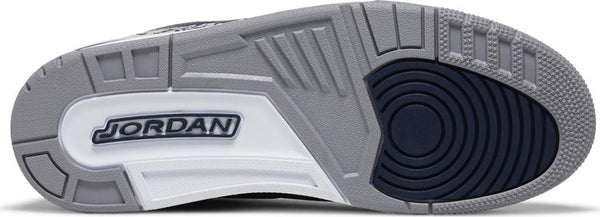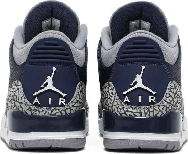 O Air Jordan 3 Retro 'Georgetown' está vestido com as cores exclusivas dos Hoyas, a equipe que Michael Jordan vitimou a caminho de um campeonato nacional da NCAA. A silhueta clássica apresenta uma parte superior de couro azul marinho, reforçada com sobreposições de estampa de elefante na ponta e no calcanhar. Os sucessos da marca Jumpman adornam a língua de couro sintético cinza e o painel do calcanhar moldado na cor marinho. O amortecimento leve é fornecido por uma entressola de poliuretano aprimorada com uma unidade Nike Air visível sob o calcanhar.